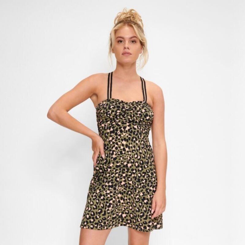 Mix en match de trendy panterprint serie van Black Panther! Deze serie krijgt door de gestreepte bandjes een sportieve uitstraling. Maak je strandlook compleet met deze soepel vallende jurk.