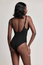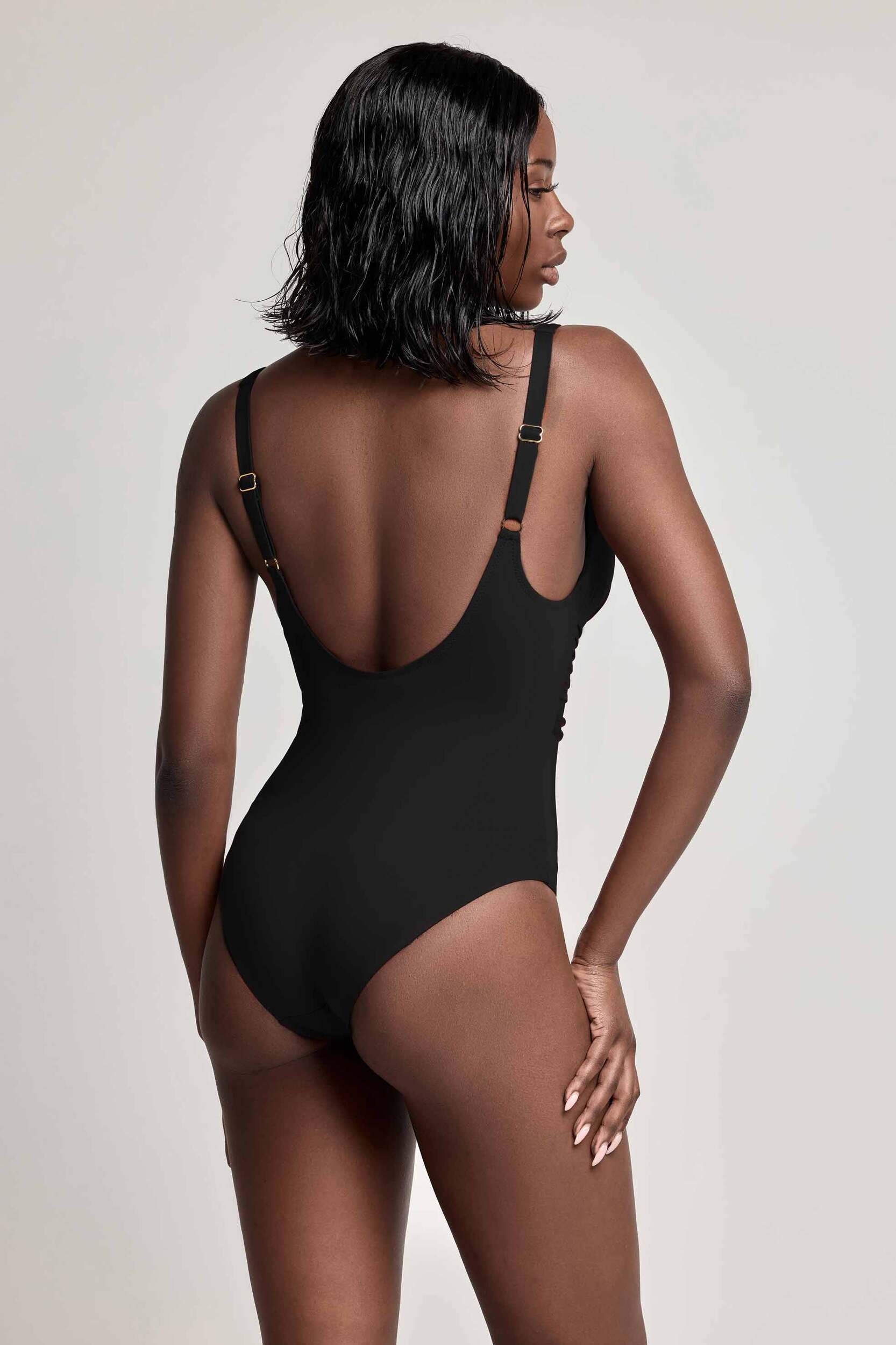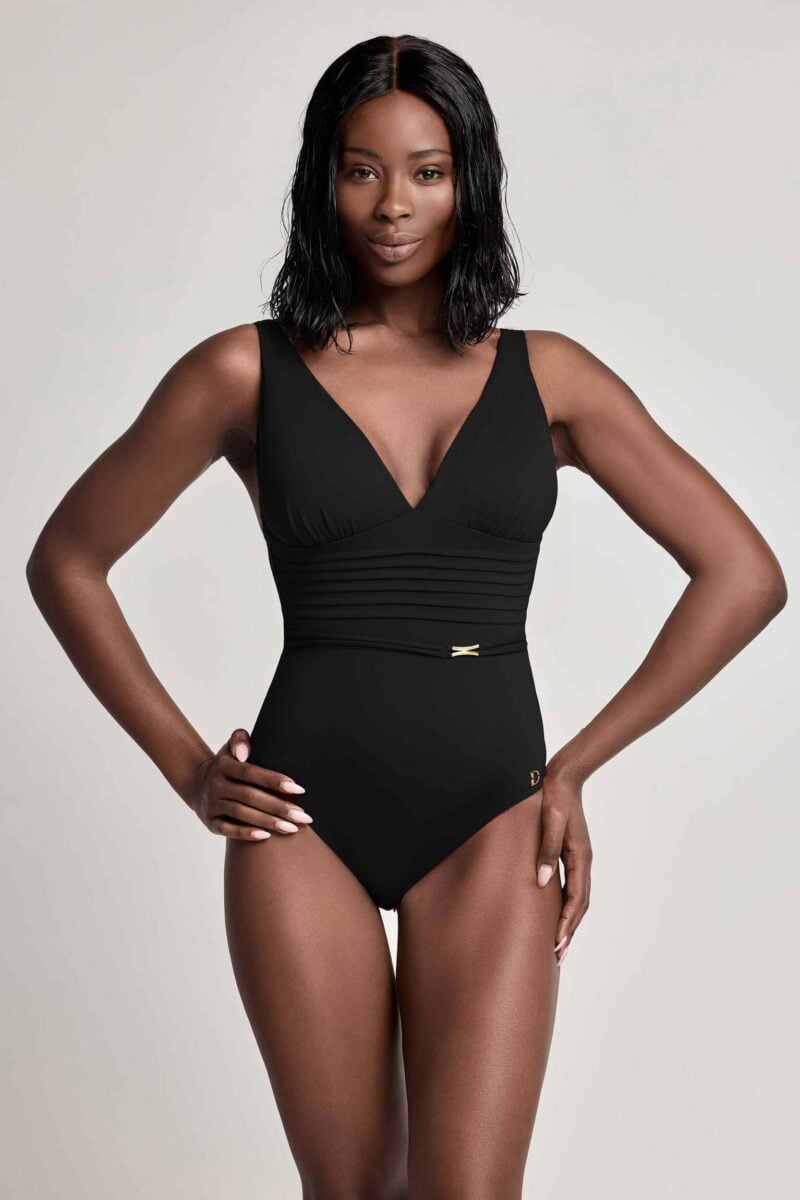 Tijdloos zwart met een vleugje goud – dit badpak straalt pure elegantie en zelfvertrouwen uit.